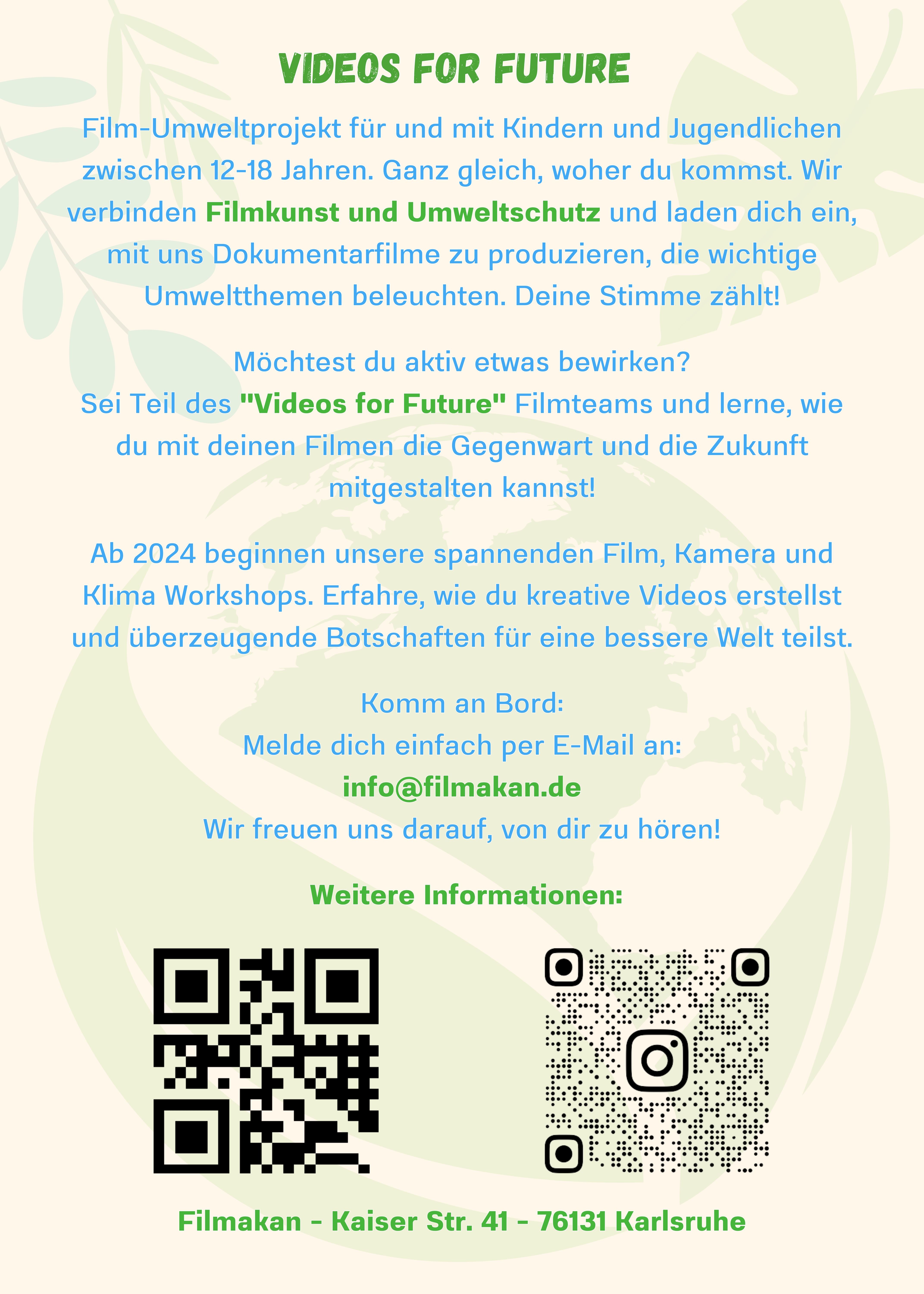 VIDEOS FOR FUTUREAb Januar 2026 starten die Workshops der 3. Staffel. sei dabei! Schreib uns an info@filmakan.de wir freuen uns auf dich!Gemeinsam gestalten wir eine bessere Zukunft.